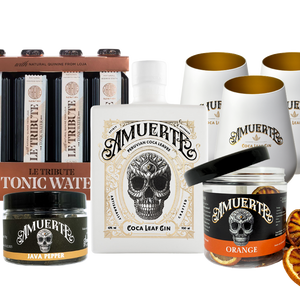 Riempi un bicchiere Amuerte con del ghiaccio e aggiungici 60 ml di Amuerte White Gin e qualche grano di pepe. Mescola delicatamente il tutto e aggiungici una "Le Tribute" Tonic Water. Completa il cocktail con alcune fette di lime 100% naturale.